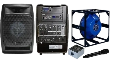 The Synchro Swag Shop proudly presents the CAWSS-Stageman System, a patented Complete Air & Water Sound System designed for the sport of Synchronized Swimming. This highly portable battery operated system operates for up to 10 hours per charge, and faithfully reproduces your music files via Bluetooth connection to phone, tablet, or computer, or via USB flash drive or SD card inserted into the built-in digital player/recorder. Separate 250 watt amplifiers and volume controls allow independent volume level settings of the built-in 8 inch coax woofer for the natatorium, and the externally connected 9.250 inch Lubell underwater speaker lowered to the bottom of the 25 meter swimming pool.